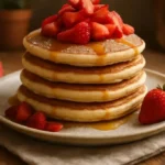 Serve Up: Stack the pancakes on plates, top with fresh strawberry slices, and drizzle with maple syrup or whipped cream if desired.